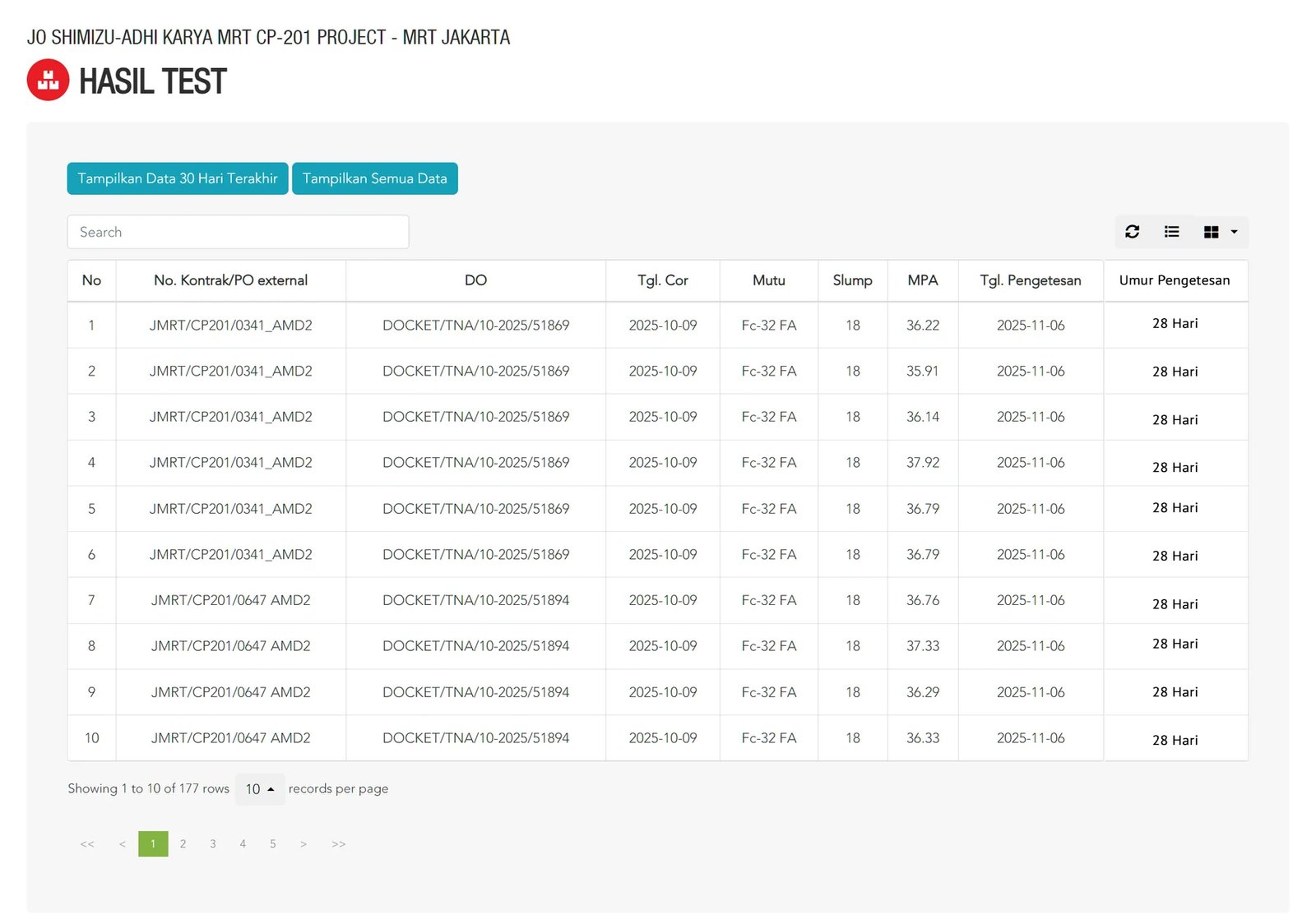 Untuk melihat hasil tes benda uji beton bisa melalui aplikasi Costumer Self Service di https://adhimixrmc.co.id/css/ pada menu “Hasil Tes”