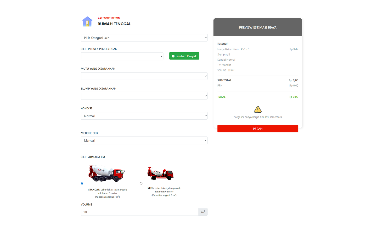 Baik, untuk cor _*Rumah Tinggal*_ bisa menggunakan mutu beton *Beton K225* Truck Standar : Rp 775.000 /m3 Truck Minimix : Rp 1.145.000 /m3 *Beton K250*